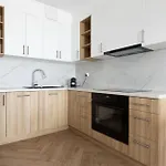 Boendet har ett utrustat pentry utrustat med kylskåp, ugn och köksredskap. Busshållplatsen Centrum Handlowe Batory är belägen ganska nära det strandnära boendet.